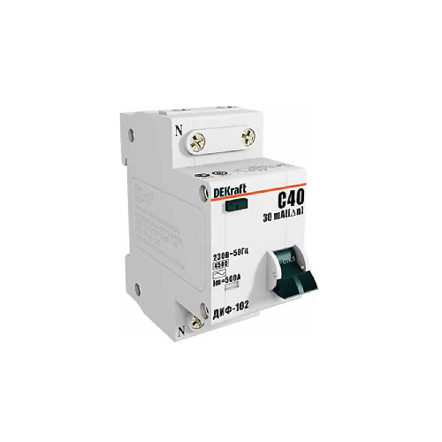 АВДТ (автоматический выключатель дифференциального тока) DEKRAFT (торговая марка компании Schneider Electric). Совмещает в себе функционал дифавтомата и УЗО, благодаря чему реагирует на короткие замыкания, перегрузки в электросети,утечки электротока, путём размыкания контактов и отключения пользователя от электросети.