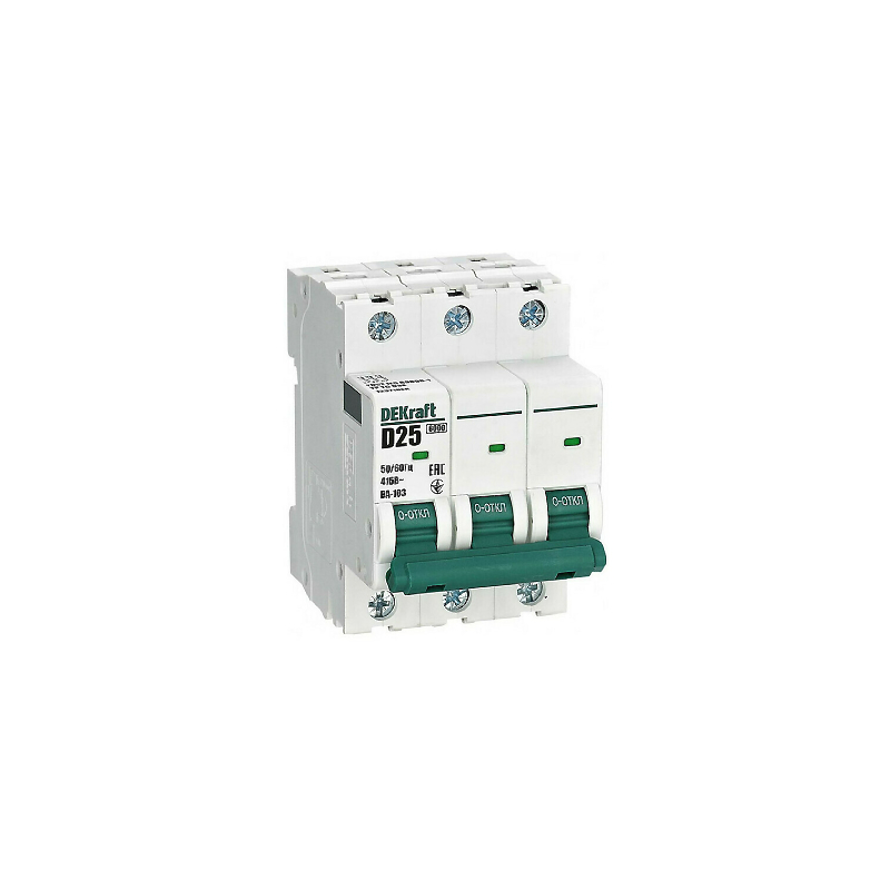Автоматический выключатель серии ВА-103 NEW DEKraft — 3P, номинальный ток 25 А — характеристика D — отключающая способность 6 кА, что позволяет использовать аппараты в качестве вводных. 5 монолитных заклепок повышают прочность корпуса аппарата. Окошко-индикатор всегда показывает состояние контактов вне зависимости от положения рукоятки управления. Боковые каналы охлаждения повышают стабильность работы при высоких температурах окружающей среды. Есть возможность установки дополнительных аксессуаров с левой стороны устройства. Аппарат на 100% совместим с корпусами и оболочками DEKraft, Systeme Electric.