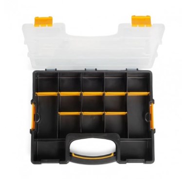 Пластиковый кейс-органайзер с модульными отделениями для хранения мелких деталей.