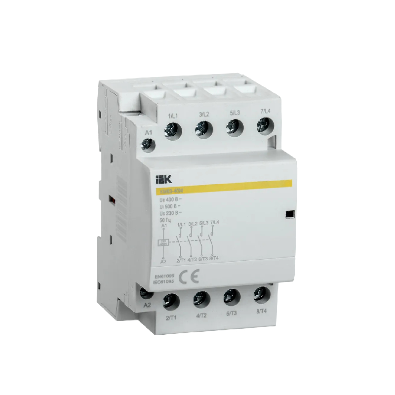 Контакторы модульные типа КМ торговой марки IEK предназначены для применения в сетях переменного тока напряжением до 400 В частоты 50 Гц и служат для коммутации слабоиндуктивных нагрузок с номинальным током до 63 А.