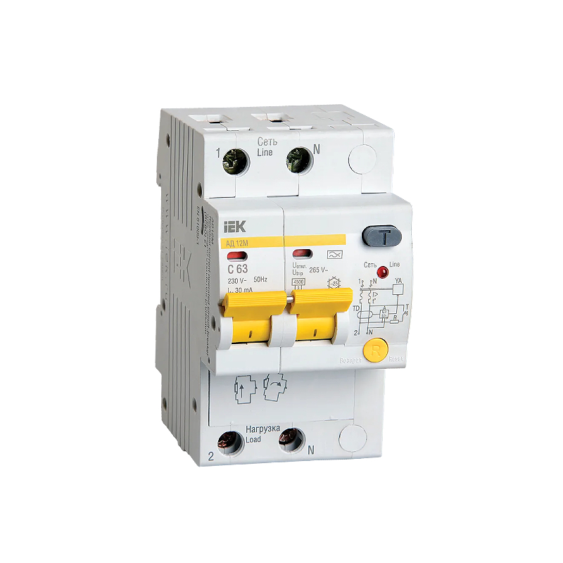 В изделиях предусмотрена индикация срабатывания от дифференциального тока, а для АД12М также светодиодная индикация включенного состояния. АД12М сохраняет работоспособность при снижении напряжения электрической сети до 110 В.